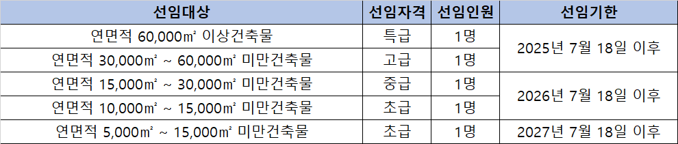 | 유지관리 지침서구비 | 선임전 | 건축준공전 | 관리주체 |